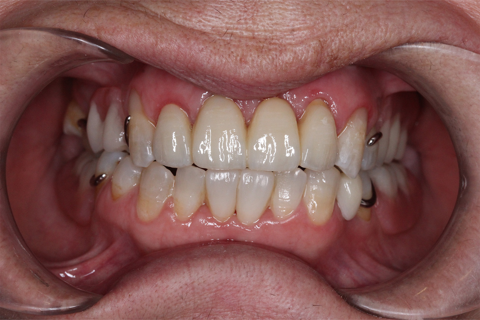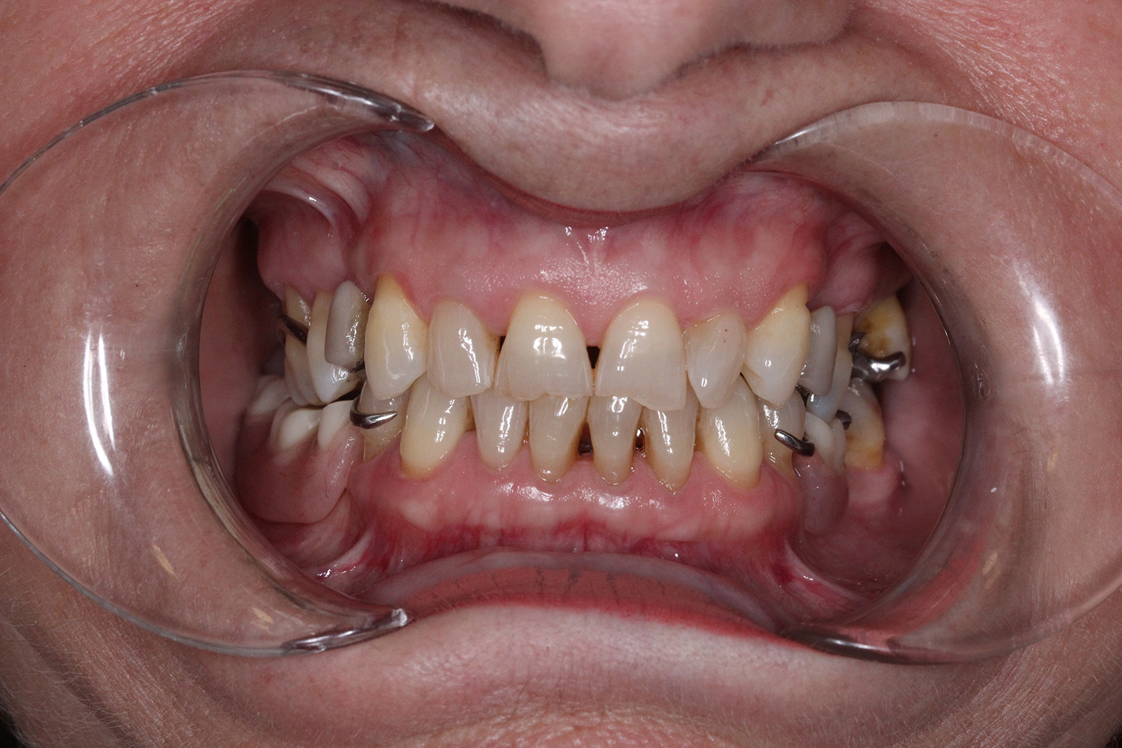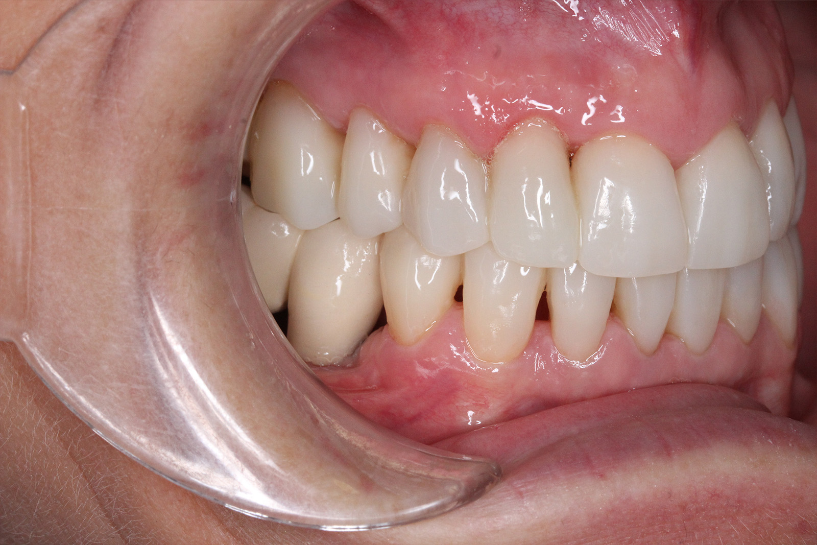 Se colocaron coronas sobre los dientes 11, 12, 21 y 22, fundamentales en la zona estética, logrando un aspecto natural y perfectamente integrado. Completamos la rehabilitación con inyección de composite en los incisivos inferiores, mejorando su alineación y volumen, y colocamos una prótesis esquelética superior e inferior, que devolvió a Alfonsa la capacidad de masticar con comodidad y confianza.